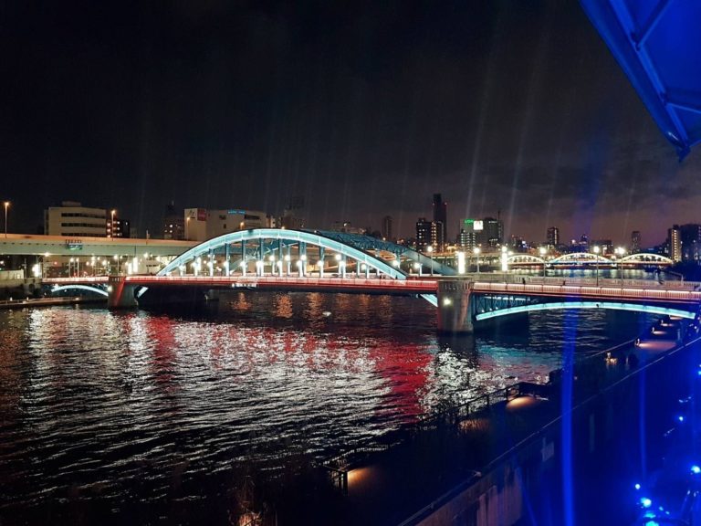 (2019年12月、浅草のセーヌ川〈別名隅田川〉脇のカフェ・ムルソー〈CAFE MEURSAULT〉で行われた若衆研の忘年会。そこから見える駒形橋の夜景。美しい中にどこか懐かしさが漂うのは、その名前からか。)