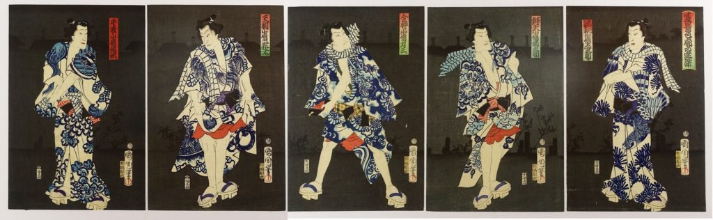 この浮世絵、江戸末期のどんづまりで刊行されたものですが、盗賊五人衆?だけあって、夜中に出没します。五人の背景は漆黒で、すぐ後ろに墓原、遠くに町の屋根が連なります。この景色を背に五人の浴衣姿がまさに伊達でして、爽やかさを醸し出しています。