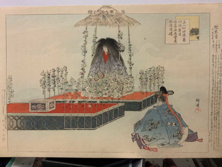 (能楽図絵『枕慈童』月岡耕漁画、明治31年、松木平吉版。月岡耕漁は、月岡芳年・尾形月耕の弟子。繊細な描写をもとにして能楽絵で評判をとった)